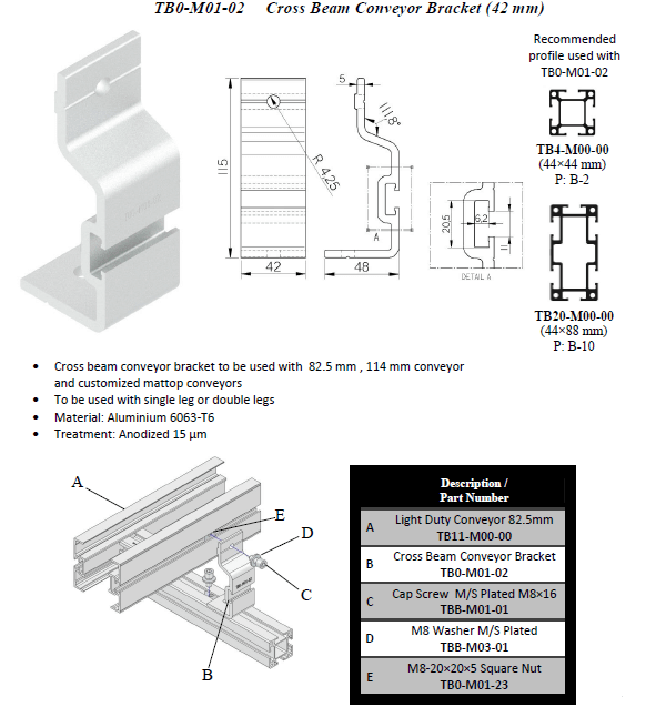 | Features | Cross beam conveyor bracket to be used with 82.5 mm 114 mm conveyor and customised mattop conveyors. To be used with single leg or double legs. |