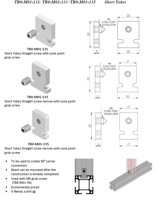| Application | To be used to bond strong 90° corner connection. Beam can be mounted after the construction is already completed. Used with M6 grub screw (TBB-MO1-56). Economically priced. Needs a drill jig. |