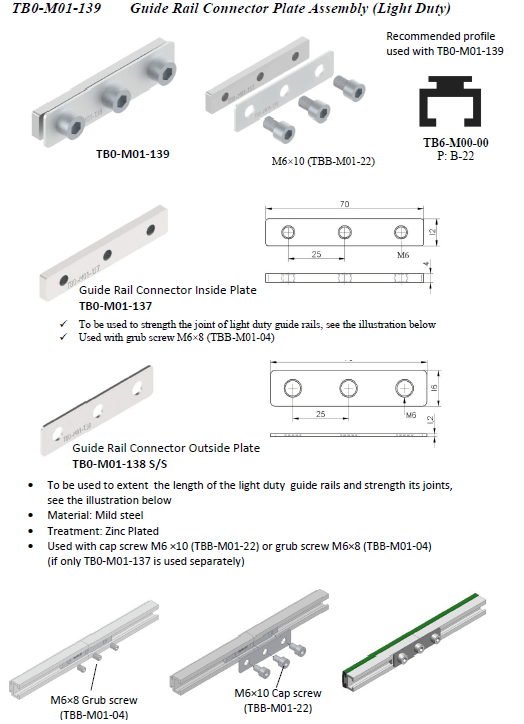 | Application | To be used to extend the length of the light duty guide rails and strengthen its joints. Used with cap screw M6x10 (TBB-M01-22) or grub screw M6X8 (TBB-M01-04) (if only TB0-M01-137 is used separately). |