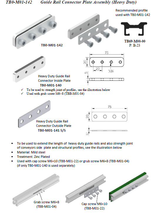 | Application | To be used to extend the length of the heavy duty guide rails and strengthen joint of conveyors side plate and structural profiles. Used with cap screw M6x10 (TBB-M01-22) or grub screw M6X8 (TBB-M01-04) (if only TB0-M01-140 is used separately). |