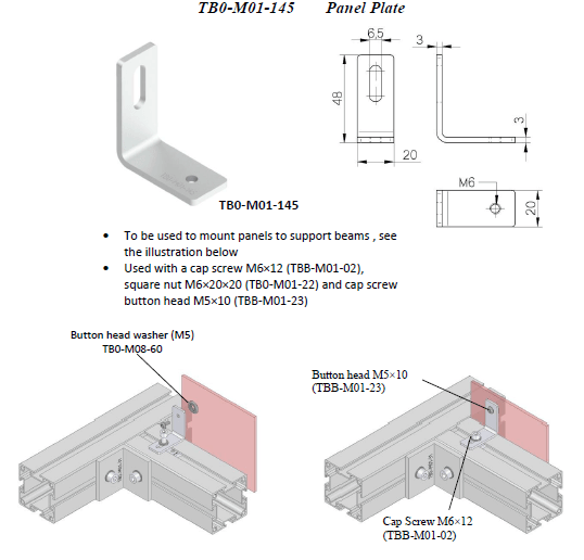 To be used to mount panels to support beams. Used with cap screw M6x12 (TBB-M01-02), square nut M6X20X20 (TBB-M01-22) and cap screw button headM5x10 (TBB-M01-23).