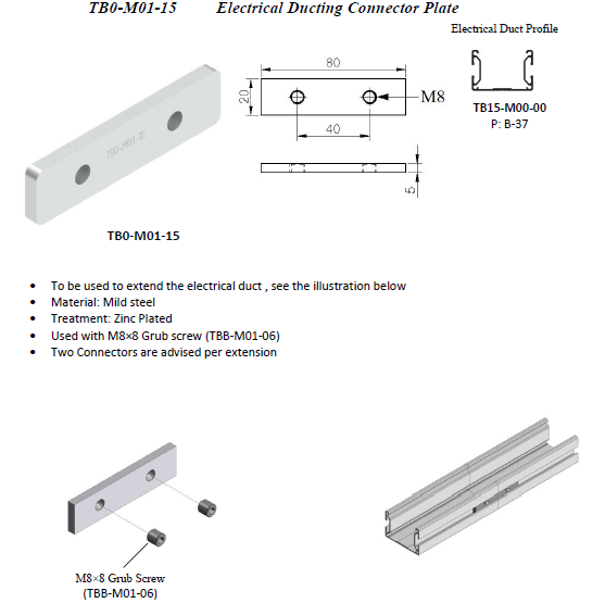 To be used to extend the electrical duct. Used with M8x8 grub screw (TBB-M01-06). Two connectors are advised per an extension.