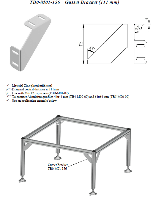 Diagonal central distance is 111mm. Use with M6x12 cap screw (TBB-M01-02). To connect Aluminium profiles 44×44 mm (TB-M00-00) and 64×64 mm (TB5-M00-00).