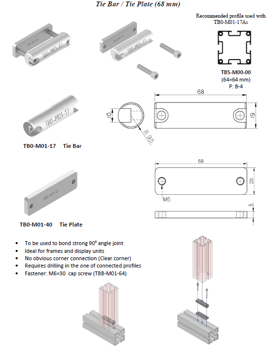 | Application | To be used to bond strong 90° angle joint. Ideal for frames and display units. No obvious corner connection (clear corner). Requires drilling in the one of profile. Fastener: M6x30 cap screw (TBB-M01-64). |