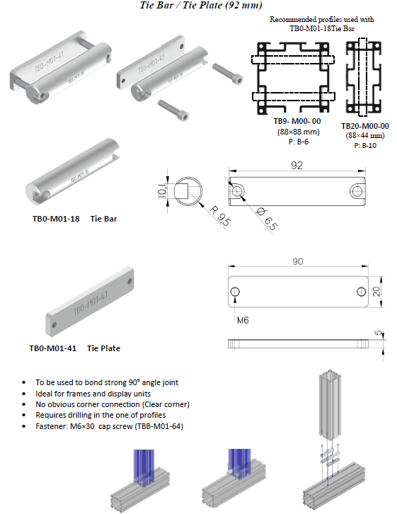| Application | To be used to bond strong 90° angle joint. Ideal for frames and display units. No obvious corner connection (clear corner). Requires drilling in the one of profile. Fastener: M6x30 cap screw (TBB-M01-64). |