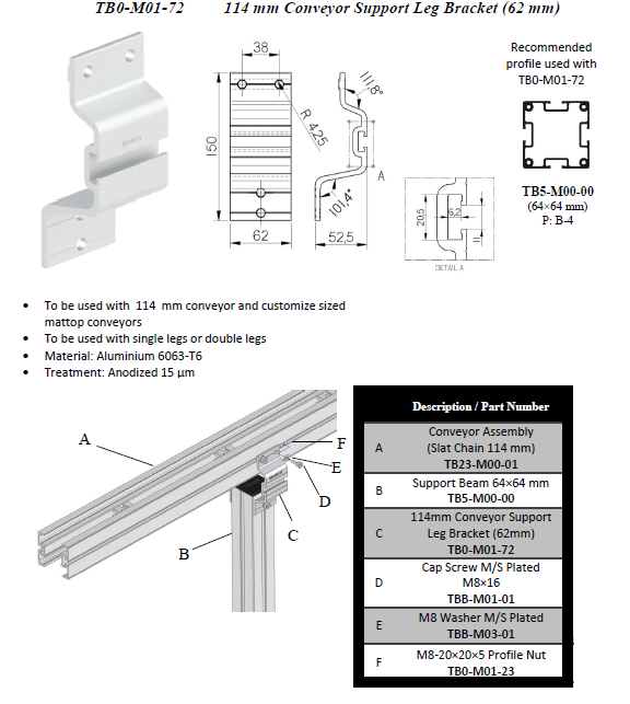 | Features | Cross beam conveyor bracket to be used with 82.5 mm 114 mm conveyor and customised mattop conveyors. To be used with single leg or double legs. |