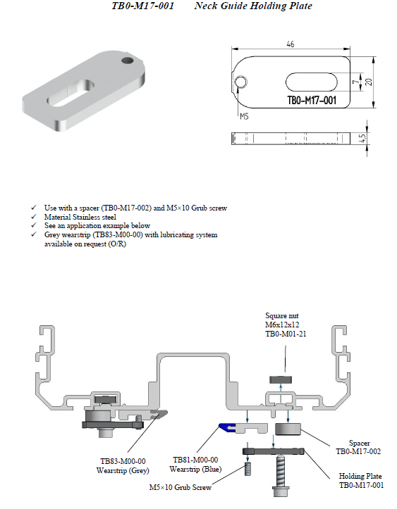 Spacer (TB0-M17-002) and M5x10 grub screw. Grey wearstrip (TB83-M00-00) with lubricating system available on request.