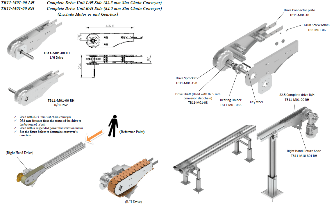 82.5mm Conveyer Slat Chain conveyer. Also with a suspended power transmission motor.