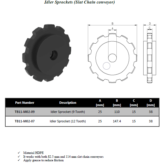 HDPE material. Works with both 82.5mm and 114mm slat chain conveyers. Apply grease to reduce friction.