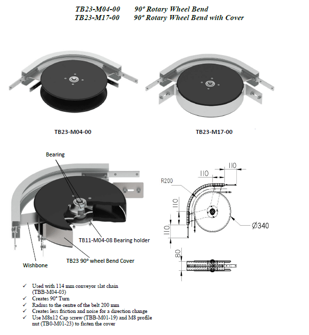 | Features | Use M8x12 Cap screw (TBB-M01-19) and M8 profile nut (TB0-M01-23) to fasten the cover. Creates less friction and noise for a discretion change. Creates 90° turn. |