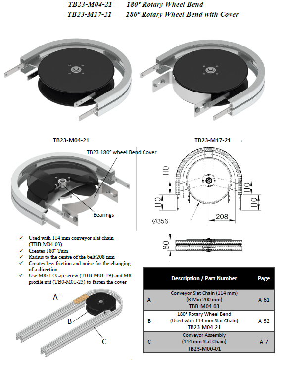 | Features | Use M8x12 Cap screw (TBB-M01-19) and M8 profile nut (TB0-M01-23) to fasten the cover. Creates less friction and noise for a discretion change. Creates 180° turn. |