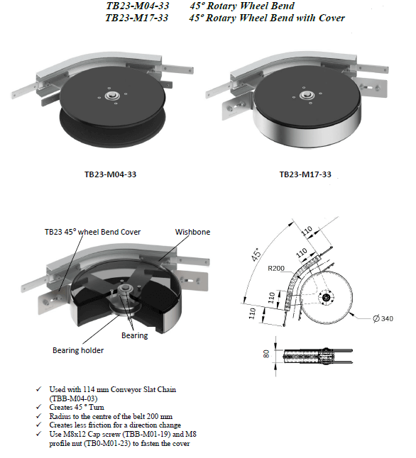 Use M8x12 Cap screw (TBB-M01-19) and M8 profile nut (TBo-M01-23) to fasten the cover. Creates less friction for a discretion change. Creates 45° turn.