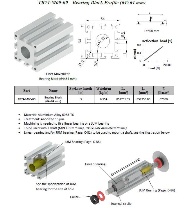 | Application | To be used wit a shaft (MIN DIA = 25mm, Bore hole diameter = 28mm for bearing). Machining is needed to fit linear bearing or JUM bearing. Linear bearing and/or JUM bearing to be used to mount a shaft (see illustration on the left). |